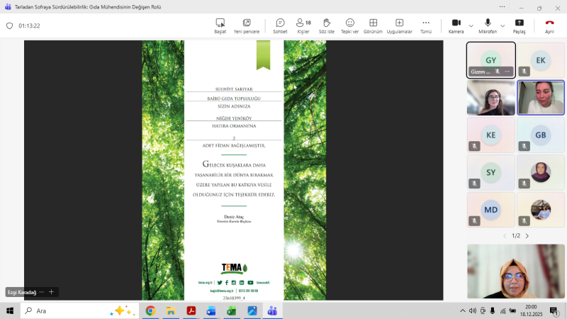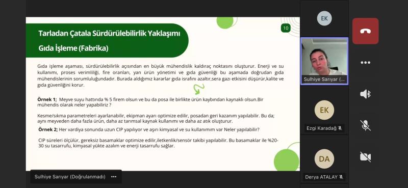 Bölümümüzde, BAİBÜ Gıda Topluluğu işbirliğiyle Gıda Mühendisi Sulhiye SARIYAR ile "Tarladan Sofraya Sürdürülebilirlik: Gıda Mühendislerinin Değişen Rolü" üzerine etkinliğimiz gerçekleştirilmiştir.