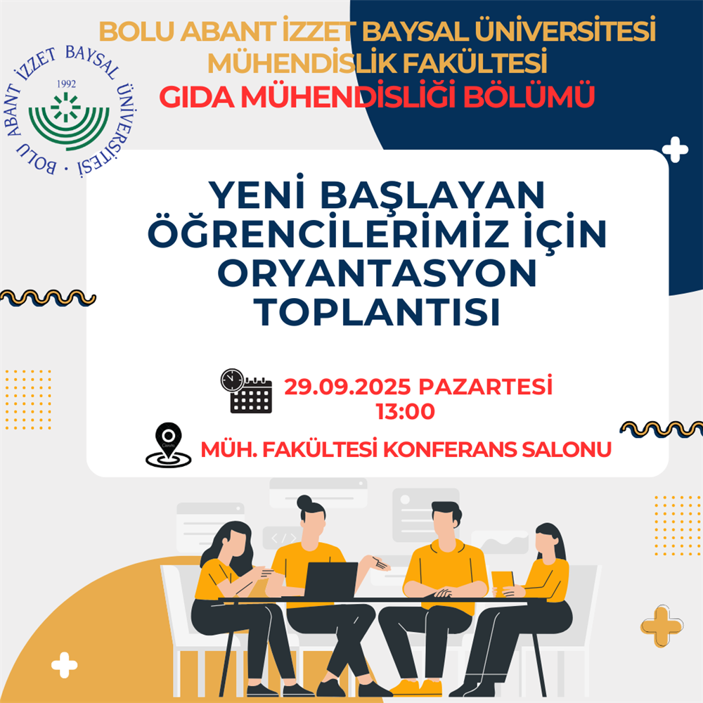 Bölümümüze yeni başlayan öğrencilerimiz için 29.09.2025 Pazartesi günü saat 13:00'da Mühendislik Fakültesi Konferans Salonunda Oryantasyon Toplantısı gerçekleştirilecektir.
